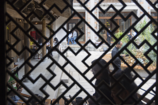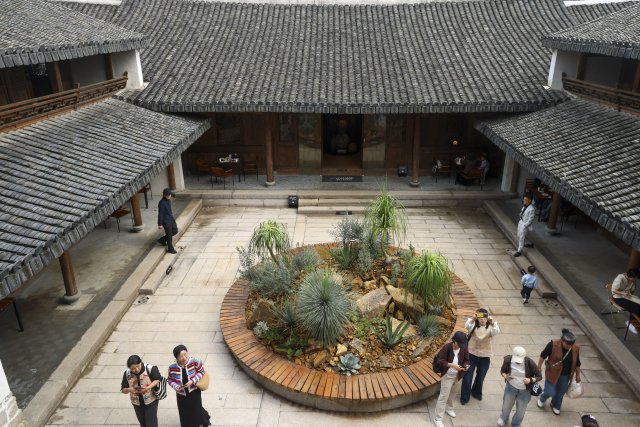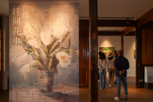 “一尺花园”打造了集咖啡轻食、文化创意、艺术展览于一体的复合美学空间。记者走进院子就能闻到咖啡香味,老房子里摆着现代的桌椅,新旧搭配倒也不觉得突兀。墙面斑驳的痕迹都留着,配上暖黄的灯光,反而有种沉淀下来的味道。找个靠窗的位置坐下,外面是湿地的水系和绿植,里面是刚做好的手冲咖啡,这种感觉有点小清新。绿植花卉巧妙点缀于柱廊与花格窗之间,既延续了建筑的历史厚重感,又注入了鲜活的时代气息。开业当日同步启动“垟间花事”胡蓉作品展,进一步强化空间文化属性。